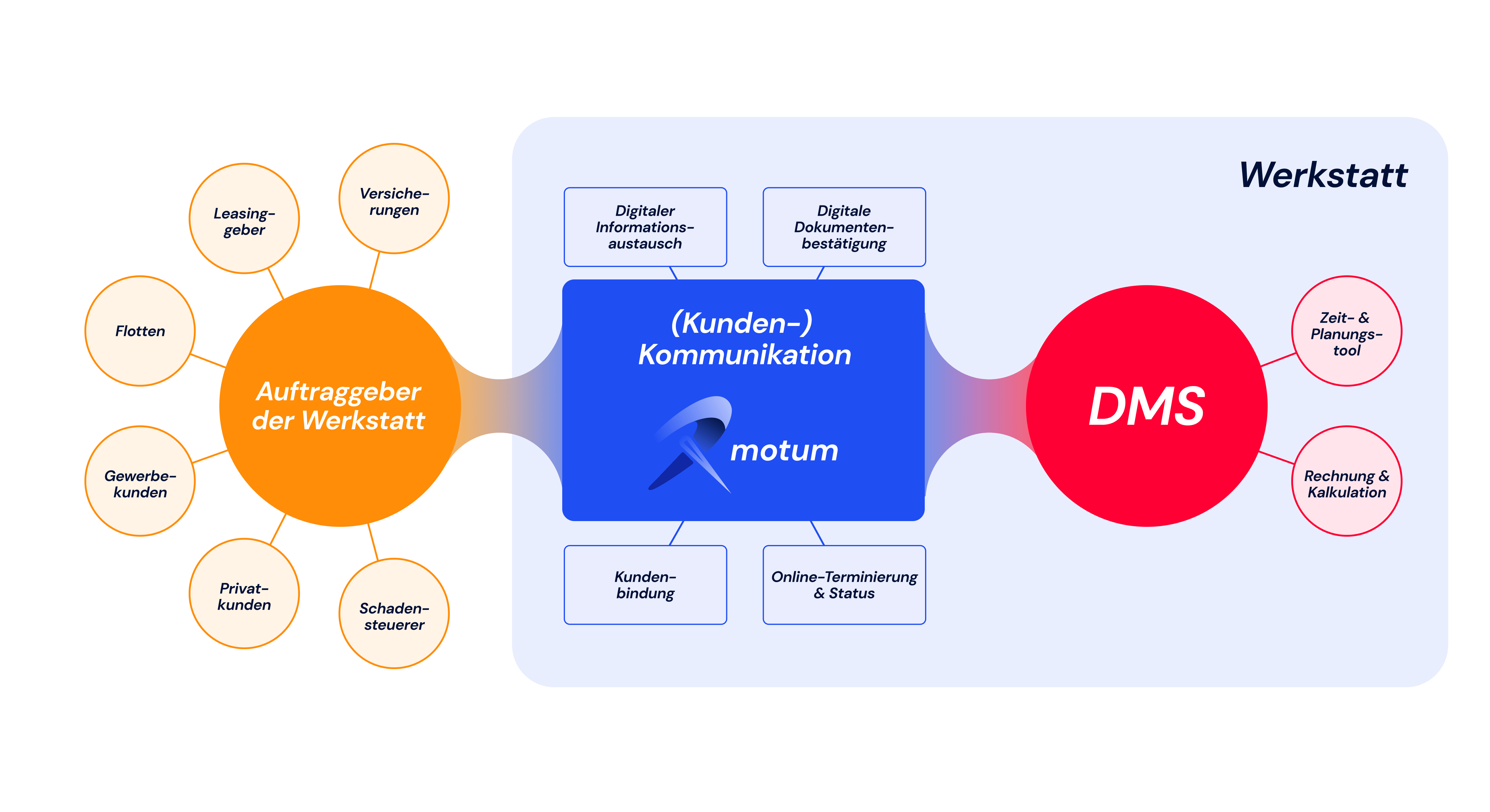 Eine Software bringt den größten Mehrwert, wenn sie nicht als Einzellösung fungiert, sondern die bestehenden Systeme miteinander verbindet. Unser "Digitaler Kundenservice" motum schafft genau diese Verbindung. Auf der einen Seite zu den Systemen bzw. der Kommunikation mit den Auftraggebern, auf der anderen Seite zu den internen Planungs- und Kalkulationssystemen (Dealer Management Systemen).