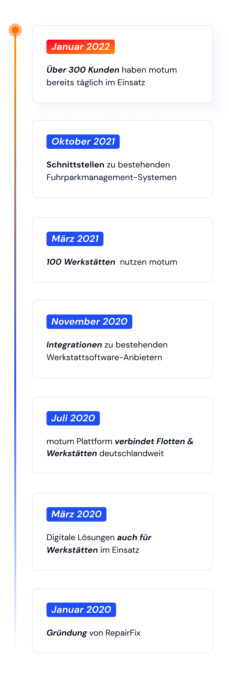 RepairFix ist ein Softwareunternehmen im Automotive Aftermarkt. Mit unserer unabhängigen Plattform "motum" vernetzen wir im Schaden- oder Wartungsfall Fuhrparkverantwortliche, FahrerInnen und Werkstätten auf intelligente und individuelle Art und Weise miteinander. Durch den Einsatz neuster Technologien ermöglichen wir damit den Wandel hin zu einer nachhaltigeren Mobilität im Automotive Aftermarkt.